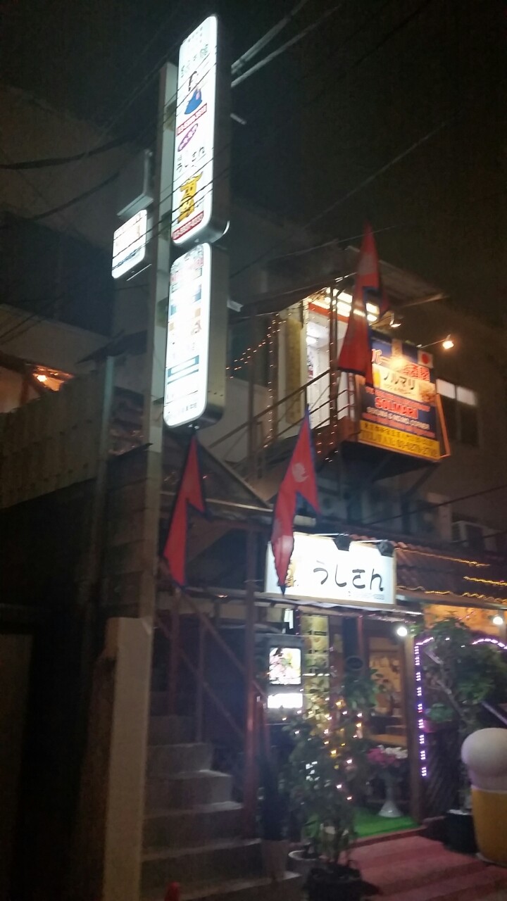 一階は以前から韓国朝鮮系(「緑香館」1店舗のだったのを分割し現在は「うしさん」と2店舗)だが、二階は過去は飲食店ではなかったと思う。しかし最近地域社会から独立? 看板では「ネパール村」を自称するようになった(写真では露出が飛んでいるが、左側真ん中のたての看板の1つに書いてある)。すぐ脇に外階段がありネパール国旗が複数かかっている。上にはネパールレストランの「ソルマリ」(確か他のブログによれば、ネパール居酒屋モモからの独立組)ほか食材店があるというが、(あるいは飲食店舗に併設? 入ってないためわからない)階段の上なのでちょっと情報なく行くには難易度が高い。しかも2階にあがっても、前にあった大韓民国なんとかなんとかって書いてある謎の木札はそのまんまだし。